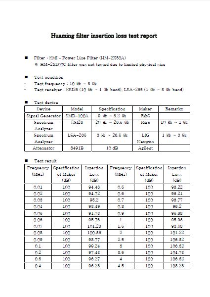 濾波器韓國國家實驗室校準證書